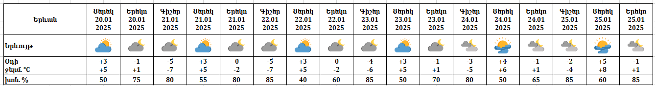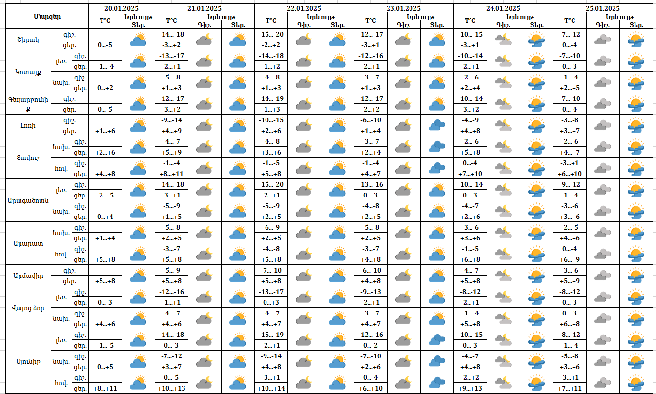 Հունվարի 20-ի ցերեկը, 21-25-ին սպասվում է առանց տեղումների եղանակ: Քամին հյուսիսարևմտյան 2-5մ/վ, հունվարի 20-ին առանձին վայրերում սպասվում է քամու ուժգնացում 15-18մ/վրկ։