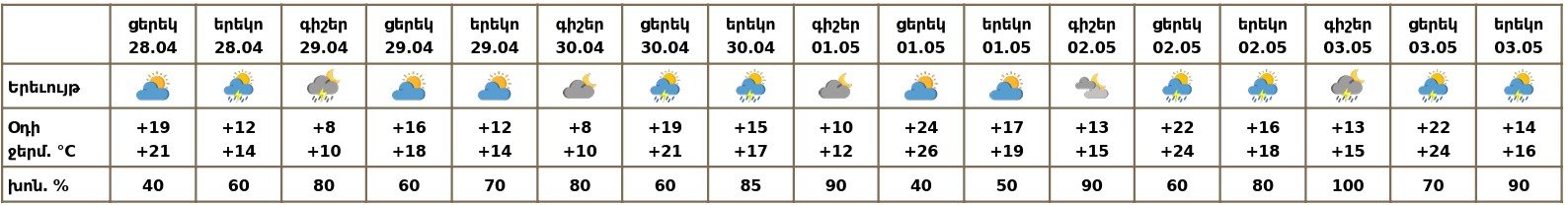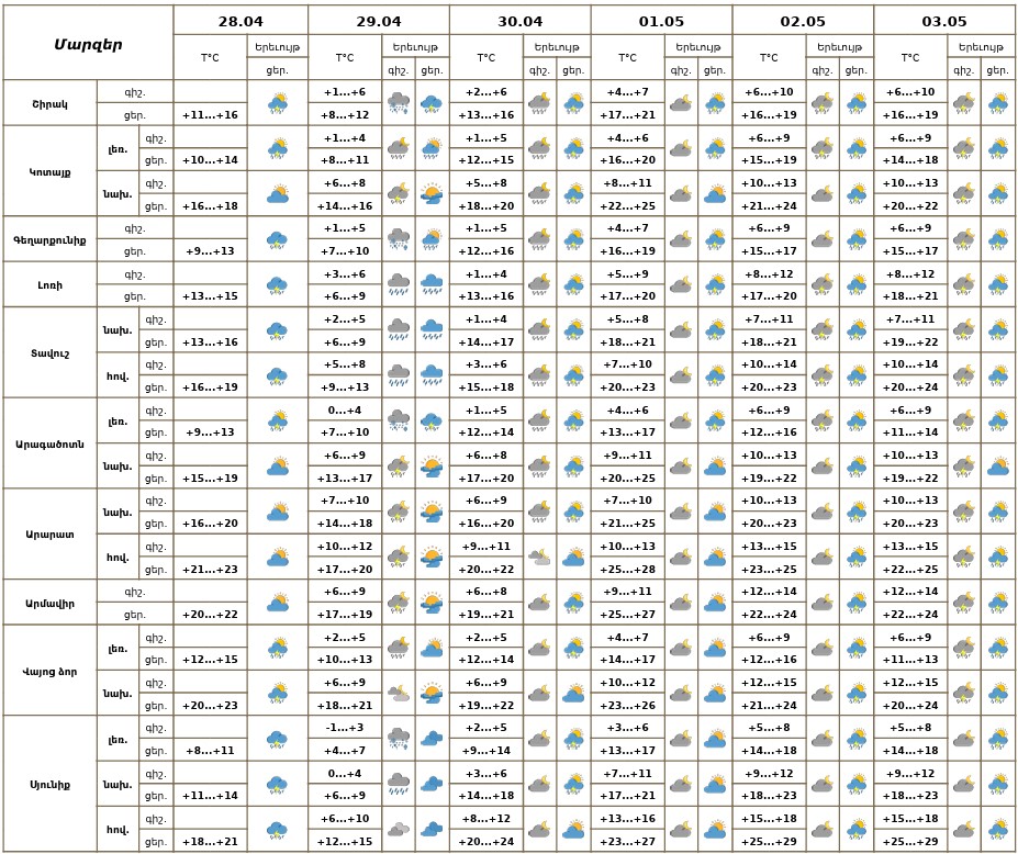 Ապրիլի 28-ի երեկոյան ժամերին, 29-30-ին, մայիսի 2-3-ին սպասվում է կարճատև անձրև և ամպրոպ, ամպրոպի ժամանակ՝ քամու ուժգնացում 15-18 մ/վ արագությամբ: Մայիսի 1-ին սպասվում է առանց տեղումների եղանակ։