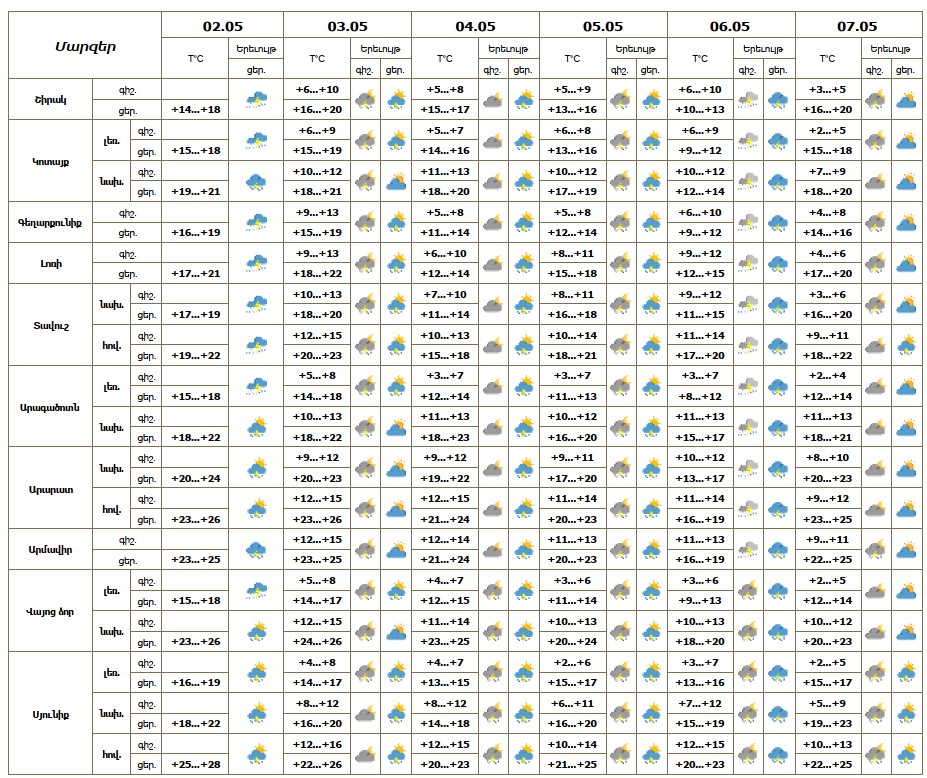 Մայիսի 2-ի և 4-ի ցերեկը, 5-6-ին շրջանների զգալի մասում, 3-ին, 4-ի գիշերը, 7-ին առանձին շրջաններում սպասվում է կարճատև անձրև և ամպրոպ, 2-ի ցերեկը, 5-6-ին առանձին վայրերում՝ հորդառատ։