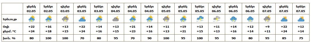 Մայիսի 2-ի ցերեկը, 3-6-ին, 7-ի գիշերը սպասվում է կարճատև անձրև և ամպրոպ։ Ամպրոպի ժամանակ սպասվում է քամու ուժգնացում 15-18 մ/վ արագությամբ: Մայիսի 7-ի ցերեկը սպասվում է առանց տեղումների եղանակ։