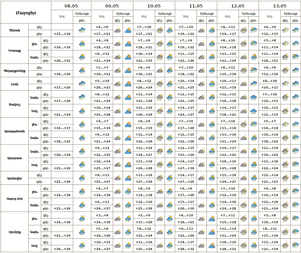 Ուշադրություն Մայիսի 8-ին կեսօրից հետո շրջանների մեծ մասում սպասվում է կարճատև անձրև և ամպրոպ, առանձին հատվածներում՝ կարկուտ։ Շիրակում, Լոռիում և Տավուշում սպասվող անձրևները կլինեն հորդառատ։