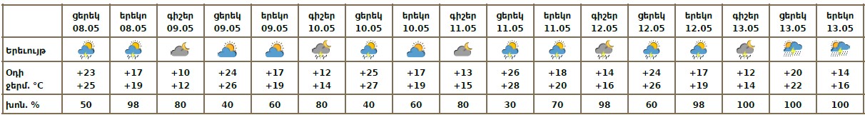 Մայիսի 8-ի ցերեկը, 10-13-ին սպասվում է կարճատև անձրև և ամպրոպ։ Ամպրոպի ժամանակ սպասվում է նաև քամու ուժգնացում 15-18 մ/վ արագությամբ: Մայիսի 9-ին սպասվում է առանց տեղումների եղանակ։