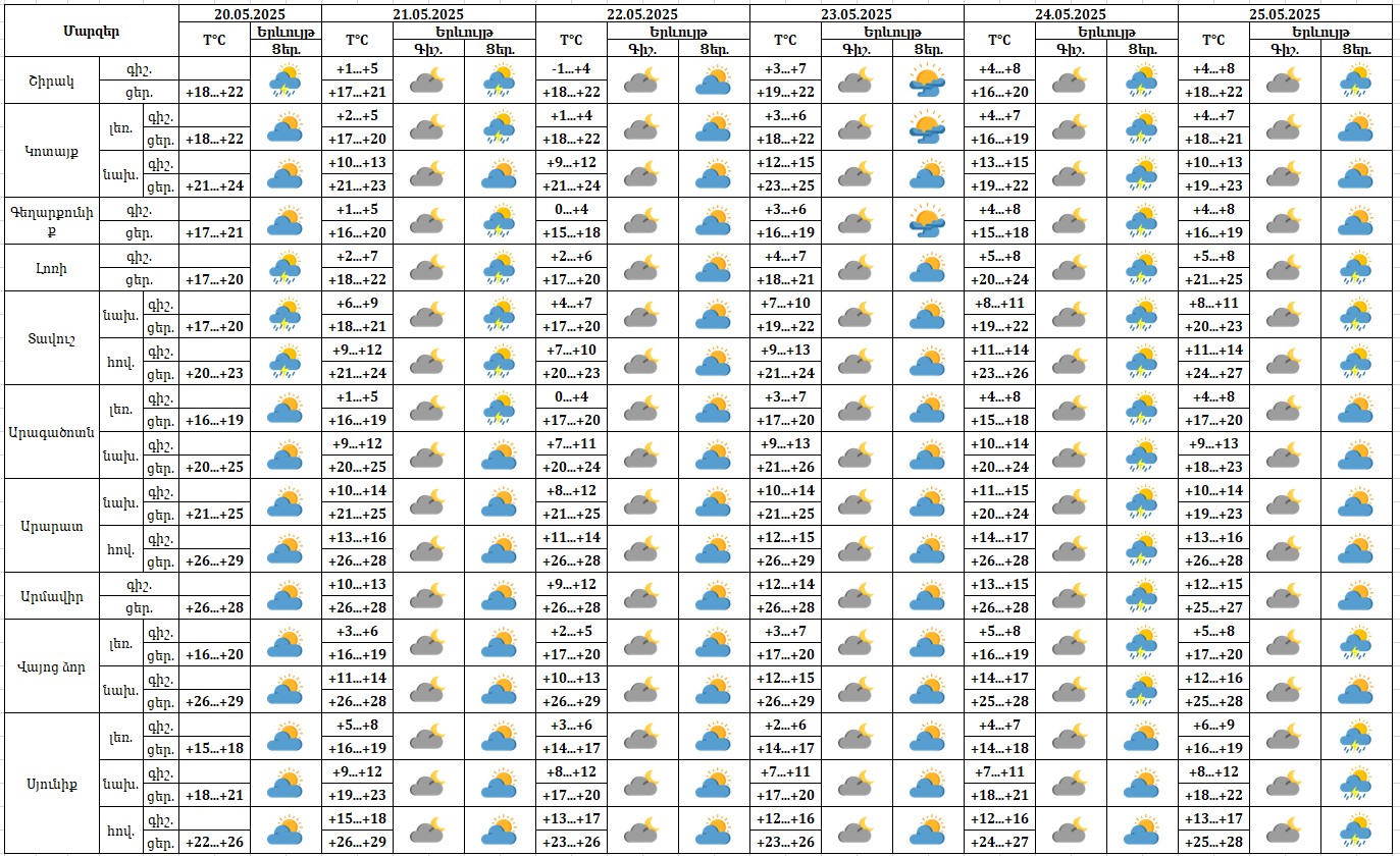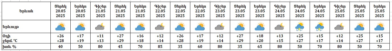 Մայիսի 20-ին, 21-ին, 24-25-ին կեսօրից հետո առանձին շրջաններում սպասվում է կարճատև անձրև և ամպրոպ։ Մայիսի 22-23-ին սպասվում է առանց տեղումների եղանակ։ Քամին՝ հարավարևմտյան՝ 2-5 մ/վ, ամպրոպի ժամանակ սպասվում է քամու ուժգնացում՝ 17-20 մ/վ արագությամբ։ Օդի ջերմաստիճանն էապես չի փոխվի։
