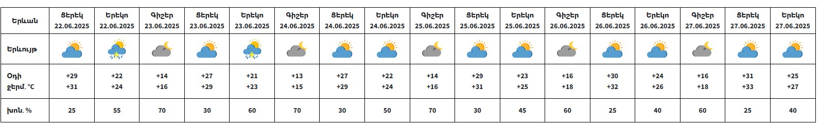 Հունիսի 22-ի ցերեկը, 23-ին գիշերը և կեսօրից հետո առանձին շրջաններում սպասվում է կարճատև անձրև և ամպրոպ, հնարավոր է նաև կարկուտ։ Հունիսի 24-27-ին սպասվում է առանց տեղումների եղանակ։ Քամին՝ հարավարևմտյան՝ 2-5 մ/վ, ամպրոպի ժամանակ սպասվում է քամու ուժգնացում՝ 18-22 մ/վ արագությամբ։ Օդի ջերմաստիճանը հունիսի 22-ի ցերեկը, 23-ին աստիճանաբար կնվազի 2-4 աստիճանով։