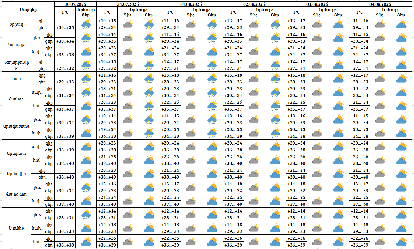 Հարավից արևադարձային տաք օդի ալիքի ներթափանցմամբ պայմանավորված՝ հուլիսի 31-ին, օգոստոսի 1-5-ին Արարատյան դաշտում, Վայոց ձորի նախալեռներում, Սյունիքի հովիտներում և Երևանում սպասվում է բարձր ջերմային ֆոն․ ցերեկը ժամը 1600-1700- ն ընկած ժամանակահատվածում՝ +38․․․+40 աստիճան տաքություն։ Նշված հատվածներում, ինչպես նաև Արագածոտնի և Կոտայքի նախալեռներում առաջիկա 5 օրերին սպասվում է նաև բարձր կարգի հրդեհավտանգ իրավիճակ: