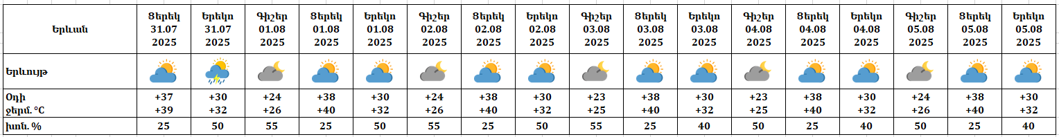 Հուլիսի 31-ին և օգոստոսի 1-2-ին կեսօրից հետո առանձին շրջաններում սպասվում է կարճատև անձրև և ամպրոպ, հնարավոր է նաև կարկուտ։ Օգոստոսի 3-5-ին սպասվում է առանց տեղումների եղանակ։ Քամին՝ արևմտյան 2-5մ/վ, ամպրոպի ժամանակ սպասվում է քամու ուժգնացում՝ 17-20մ/վ արագությամբ։ Օգոստոսի 1-5-ին երեկոյան ժամերին Արմավիրում, Կոտայքի և Արագածոտնի նախալեռներում սպասվում է քամու ուժգնացում՝ 15-18 մ/վ արագությամբ։ Օդի ջերմաստիճանն էապես չի փոխվի։