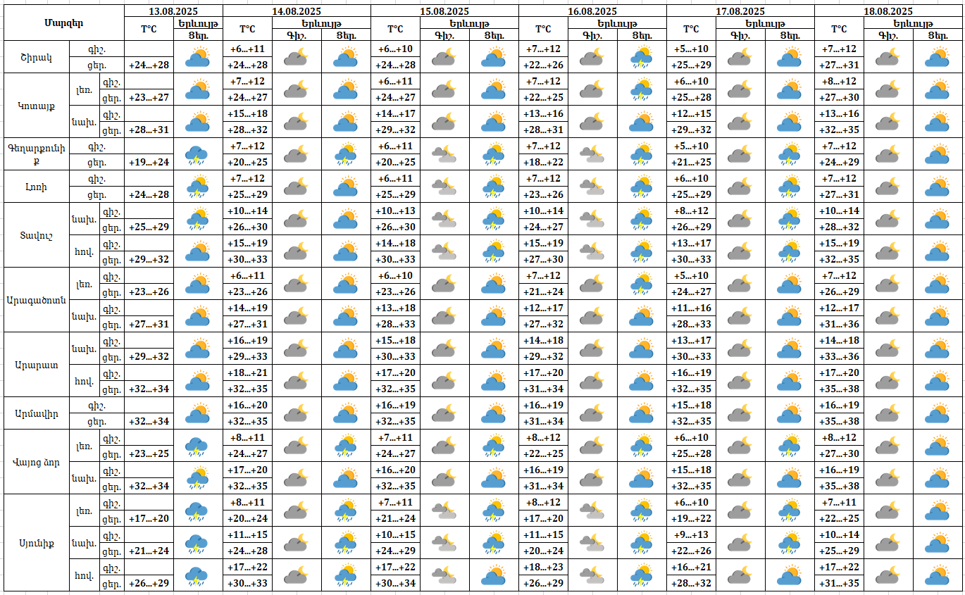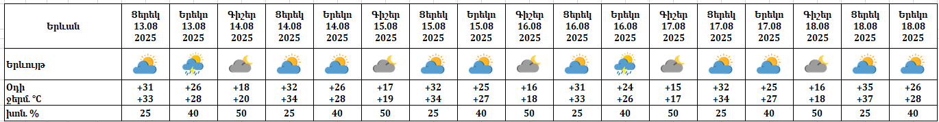 Օգոստոսի 13-ի ցերեկը, 14-17-ին կեսօրից հետո առանձին շրջաններում սպասվում է կարճատև անձրև և ամպրոպ, հնարավոր է կարկուտ: Օգոստոսի 18-ին սպասվում է առանց տեղումների եղանակ։ Քամին՝ հյուսիսարևմտյան 2-5մ/վ, ամպրոպի ժամանակ սպասվում է քամու ուժգնացում 17-20մ/վ արագությամբ։ Օգոստոսի 13-16-ին երեկոյան ժամերին Արմավիրում, Կոտայքի և Արագածոտնի նախալեռներում սպասվում է քամու ուժգնացում՝ 15-18 մ/վ արագությամբ։ Օդի ջերմաստիճանն էապես չի փոխվի։