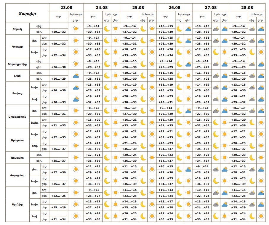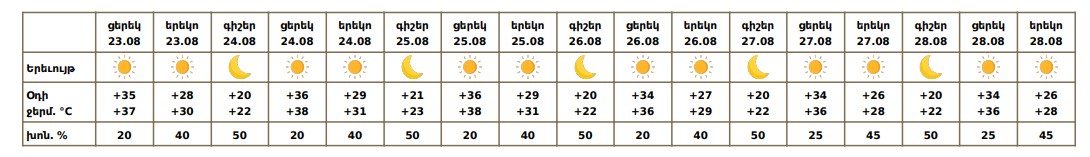 Օգոստոսի 23-ի ցերեկը, 24-28-ին սպասվում է առանց տեղումների եղանակ: Քամին՝ հարավարևմտյան 2-5մ/վ։ Օգոստոսի 25- 28-ին երեկոյան ժամերին Արմավիրում, Կոտայքի և Արագածոտնի նախալեռներում սպասվում է քամու ուժգնացում՝ 15-19 մ/վ արագությամբ։ Օդի ջերմաստիճանն օգոստոսի 23-ի ցերեկը, 24-ին աստիճանաբար կբարձրանա 3-4 աստիճանով։