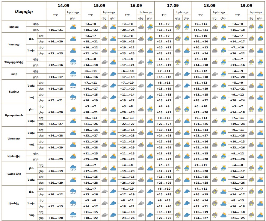 Սեպտեմբերի14-ի ցերեկը, 15-ին, 17-ին և 19-ին սպասվում է առանց տեղումների եղանակ։
