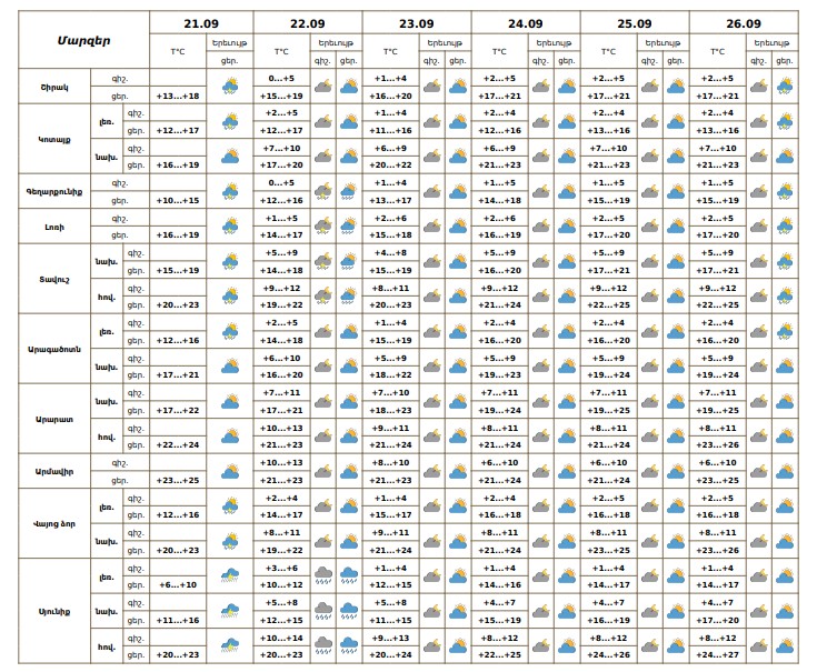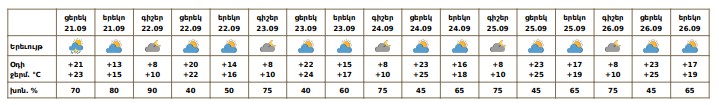 Սեպտեմբերի 21-ի ցերեկը, 22-ին, 26-ին առանձին շրջաններում սպասվում է կարճատև անձրև և ամպրոպ։ Սեպտեմբերի 23-25-ին սպասվում է առանց տեղումների եղանակ։ Քամին՝ հյուսիսարևելյան՝ 5-9մ/վ, ամպրոպի ժամանակ սպասվում է քամու ուժգնացում՝ 18-22մ/վ արագությամբ։ Օդի ջերմաստիճանն էապես չի փոխվի։