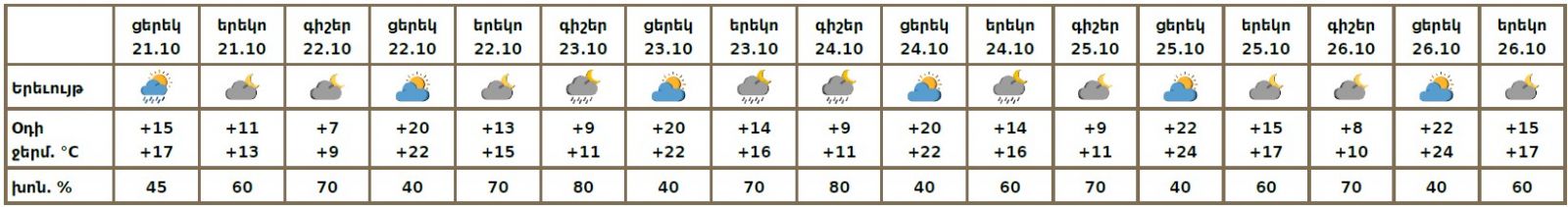 Հոկտեմբերի 21-ի ցերեկը, 23-24-ին սպասվում է կարճատև անձրև։ Հոկտեմբերի 22-ին, 25-26-ին սպասվում է առանց տեղումների եղանակ։