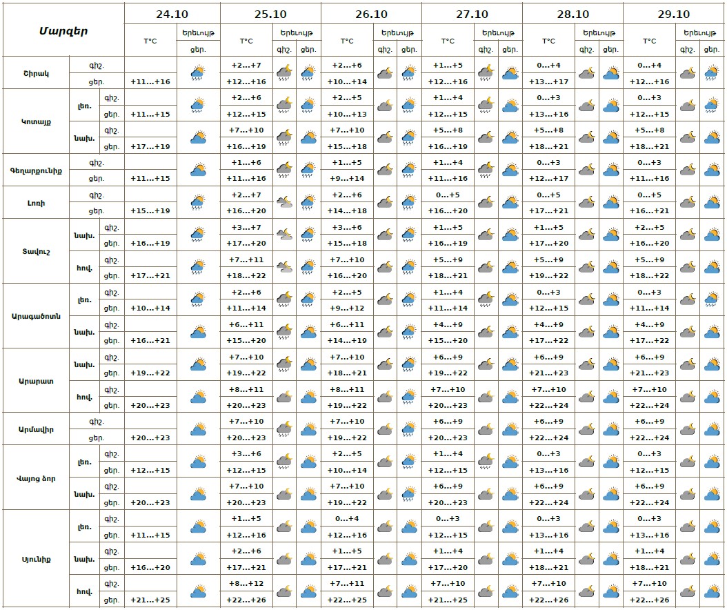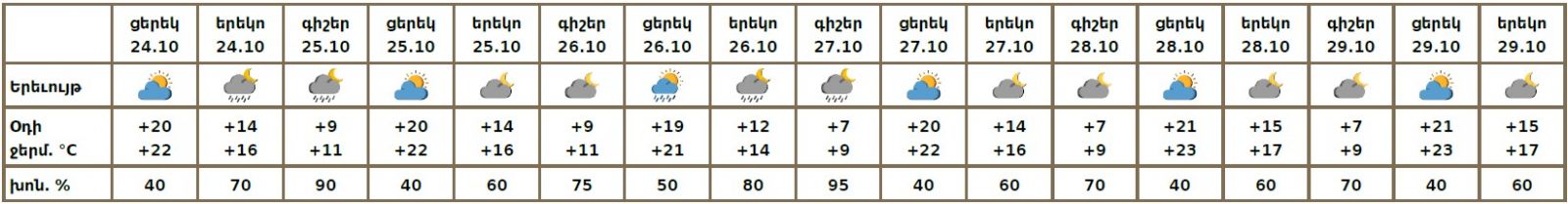 Հոկտեմբերի 24-ի երեկոյան ժամերին, 25-ի գիշերը, 26-ին, 27-ի գիշերը սպասվում է կարճատև անձրև։ Հոկտեմբերի 25-ի և 27-ի ցերեկը, 28-29-ին սպասվում է առանց տեղումների եղանակ։