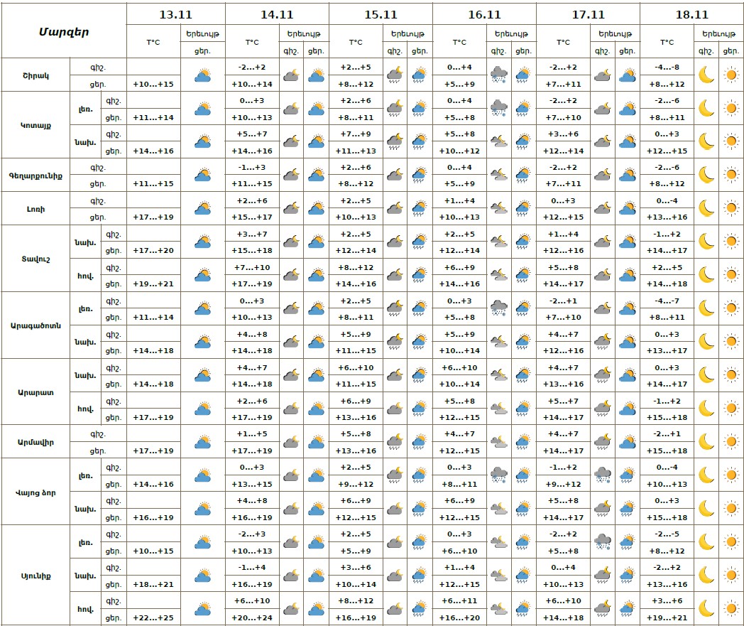 Նոյեմբերի 13-ի ցերեկը, 14-ին, 18-ին սպասվում է առանց տեղումների եղանակ: Նոյեմբերի 15-17-ին առանձին շրջաններում սպասվում են կարճատև տեղումներ, գիշերը լեռնային գոտիներում ձնախառն անձրևի տեսքով։ Քամին հարավարևմտյան՝ 2-5մ/վ: