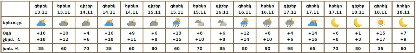 Նոյեմբերի 13-ի ցերեկը, 14-ին, 18-ին սպասվում է առանց տեղումների եղանակ։ Նոյեմբերի 15-16-ին, 17-ի գիշերը և առավոտյան սպասվում է կարճատև անձրև։