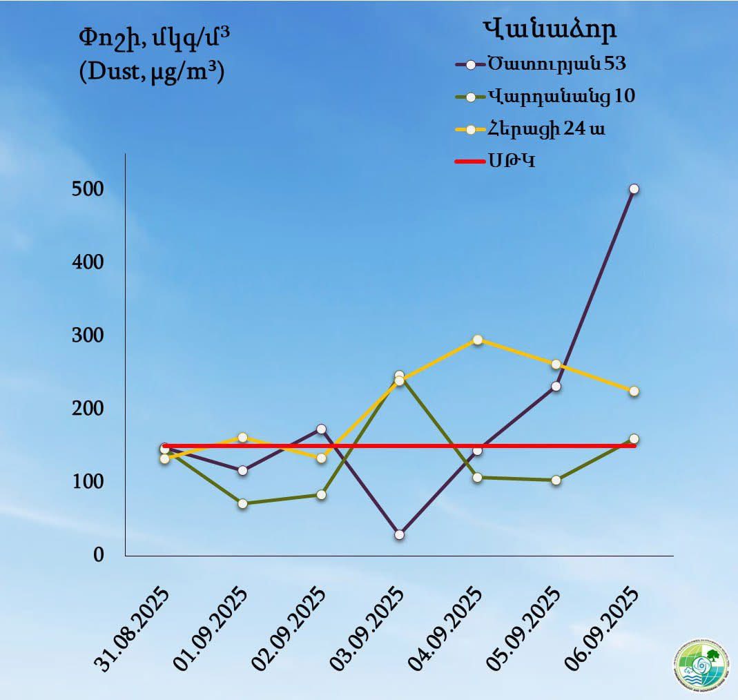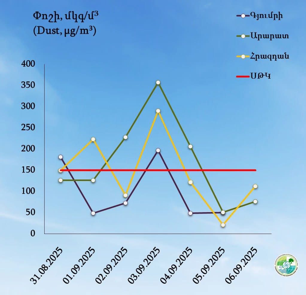 Քաղաքների մթնոլորտային օդում փոշու պարունակությունը օգոստոսի 31-ից սեպտեմբերի 6-ը (2025թ․)