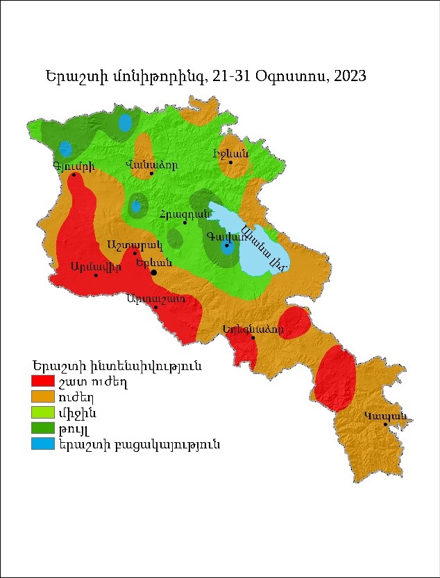 Երաշտի ինտենսիվության քարտեզը օգոստոսի վերջին տասնօրյակի համար ցույց է տալիս, որ երաշտի գոտին ընդգրկել է Արարատյան դաշտը, Վայոց Ձորը, Սյունիքը և Շիրակի նախալեռնային հատվածները։ Երաշտային պայմանները բացասական ազդեցություն են ունեցել այս շրջանների բուսականության վիճակի վրա համաձայն Landsat 8 արբանյակի բուսականության NDVI ինդեքսի քարտեզի։