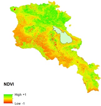 Երաշտի ինտեսնիվության գնահատականը Հայաստանում օգոստոսի վերջին տասնօրյակի համար ըստ փաստացի տվյալների (ձախ) և բուսականության վիճակի NDVI ինդեքսի՝ ստացված Landsat 8 արբանյակից (աջ)