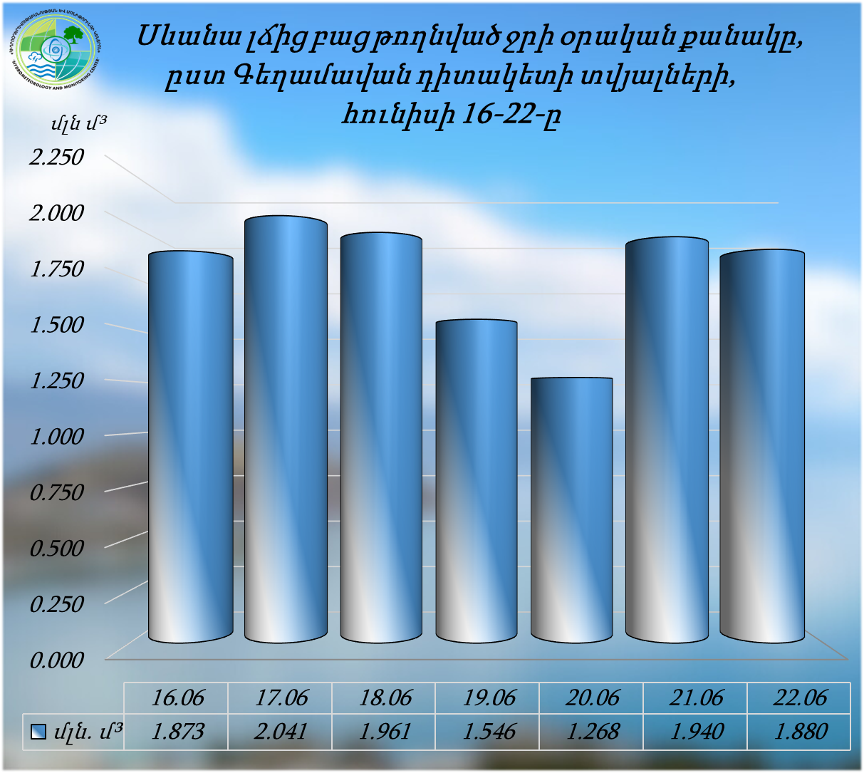 Սևանա լճից բացթողնված ջրի ծավալը ըստ Հրազդան ՀԷԿ-ի ուղղաթեք ջրանցքի Գեղամավան դիտակետի հունիսի 16-22-ը ներառյալ ընկած ժամանակահատվածում կազմել է 12.509 մլն.մ3, իսկ ընդհանուր գումարային բացթողումը՝ հունիսի 6-ից հունիսի 22-ը ներառյալ՝ 27.824 մլն.մ3: