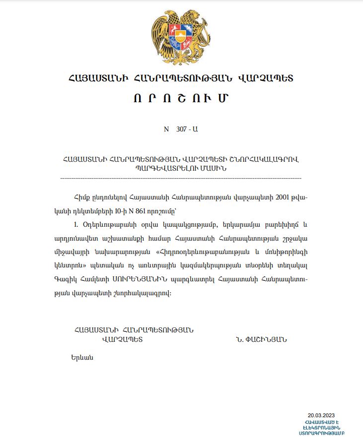ՀՀ վարչապետ Նիկոլ Փաշինյանի մարտի 20-ի N307-Ա որոշմամբ՝ Օդերևութաբանի օրվա կապակցությամբ, երկարամյա բարեխիղճ և արդյունավետ աշխատանքի համար ՇՄՆ «Հիդրոօդերևութաբանության և մոնիթորինգի կենտրոն» ՊՈԱԿ-ի տնօրենի տեղակալ Գագիկ Սուրենյանը պարգևատրվել է վարչապետի շնորհակալագրով։ Շնորհակալագիրը հանձնվել է ՇՄ նախարար Հակոբ Սիմիդյանի կողմից մարտի 23-ին՝ Օդերևութաբանության համաշխարհային օրվա և Հայաստանի Հանրապետությունում անտառագետի, ջրաբանի, օդերևութաբանի օրերին նվիրված հանդիսավոր նիստի ժամանակ։