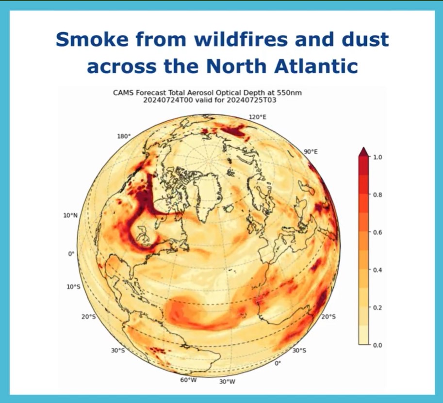25.07.2024 նտառային հրդեհի ծուխ և Սահարայի փոշին Հյուսիսային Ատլանտյան օվկիանոսում