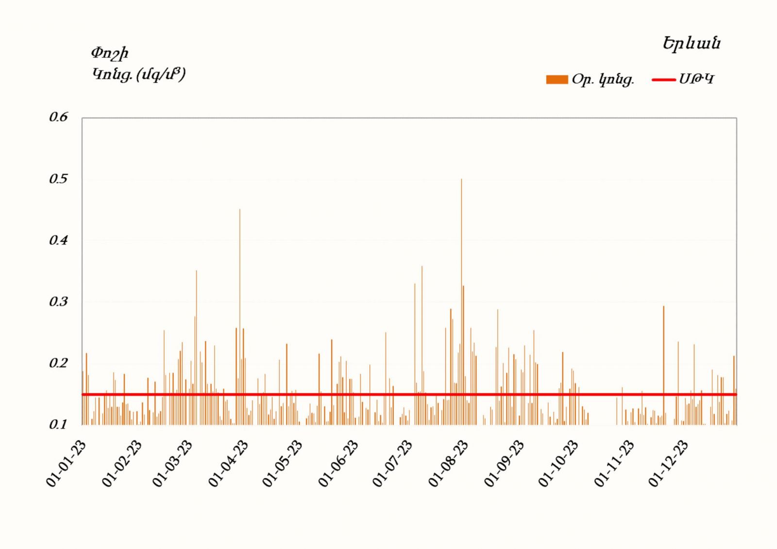 09.07.2024 2023 թվականին Երևան քաղաքի մթնոլորտային օդում որոշված ցուցանիշների միջին տարեկան կոնցենտրացիաները չեն գերազանցել համապատասխան ՍԹԿ-ները