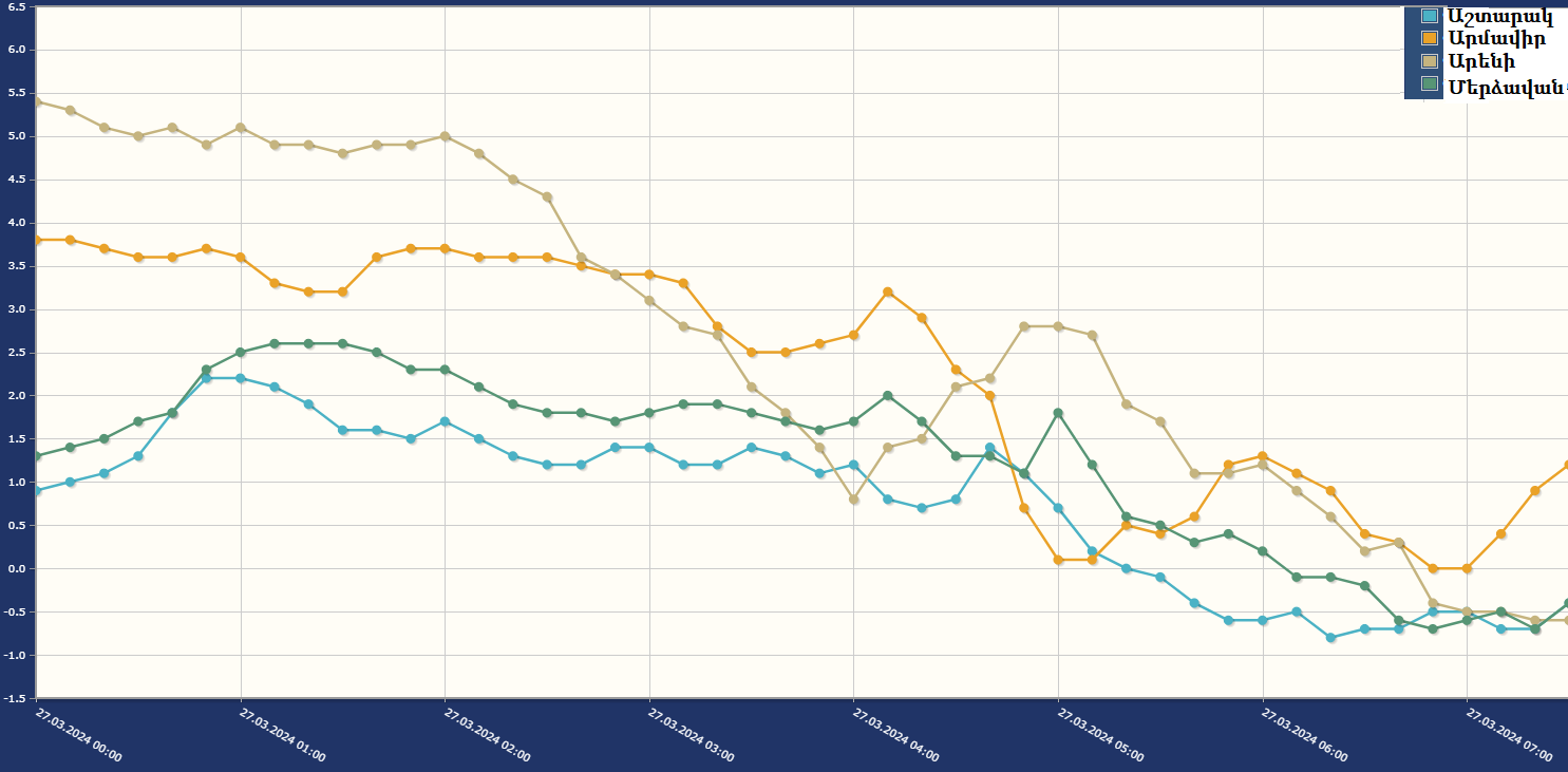 27.03.2024 «Ինչպես և կանխատեսվել էր, անցած գիշեր Արարատյան դաշտում և նրա նախալեռնային գոտիներում օդի ջերմաստիճանը կտրուկ նվազեց, սակայն ծաղկած պտղատուների համար վտանգավոր ցուցանիշներ չգրացնվեցին