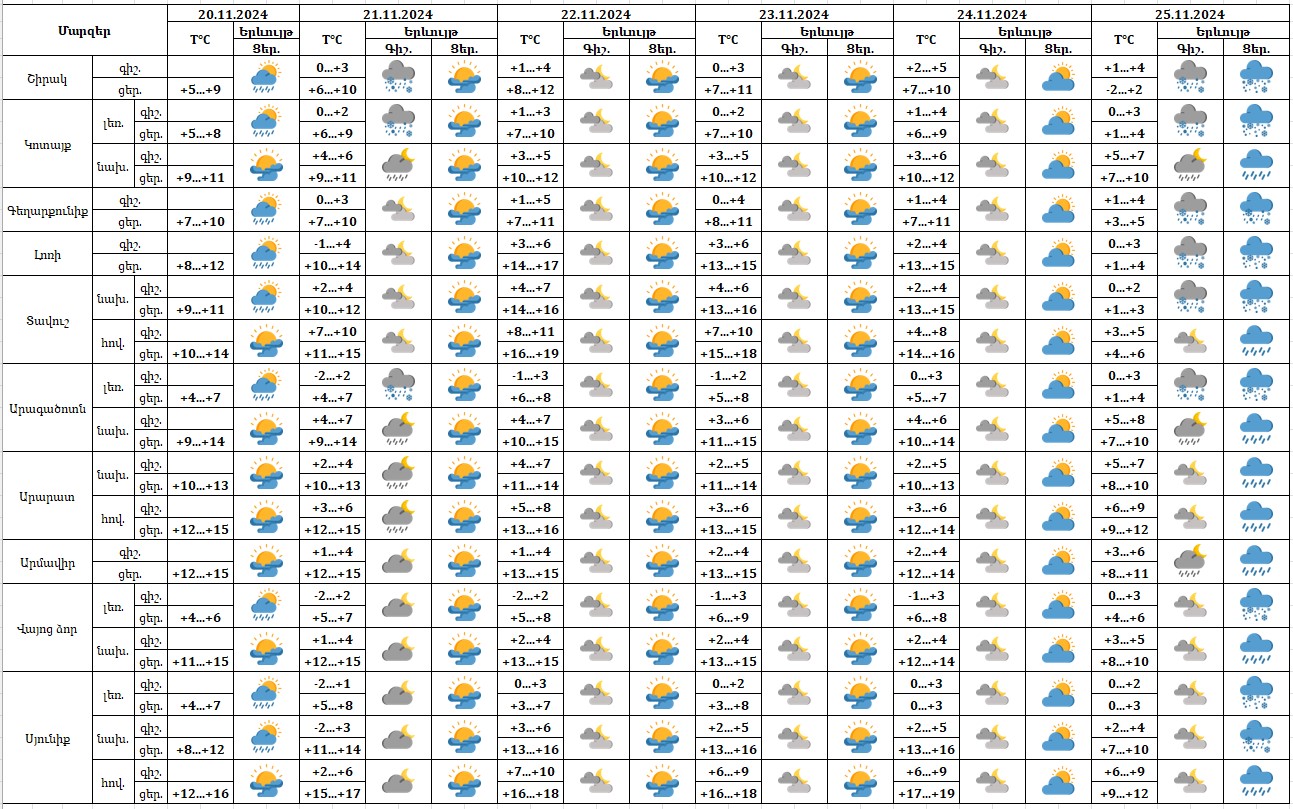 Նոյեմբերի 20-ի ցերեկը, 21-ի գիշերը, 24-ին ուշ երեկոյան, 25-ին առանձին շրջաններում սպասվում են տեղումներ, լեռնային շրջաններում՝ ձյուն։ Նոյեմբերի 21-ի ցերեկը, 22-23-ին, 24-ի գիշերը սպասվում է առանց տեղումների եղանակ։