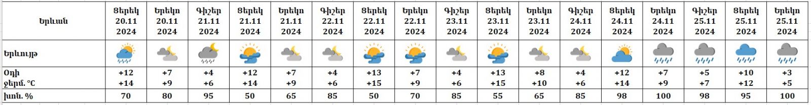 Նոյեմբերի 20-ին կեսօրից հետո, 21-ի գիշերը հնարավոր է, 24-ի ուշ երեկոյան, 25-ին սպասվում է անձրև։ Նոյեմբերի 21-ի ցերեկը, 22-23-ին, 24-ի գիշերը սպասվում է առանց տեղումների եղանակ։