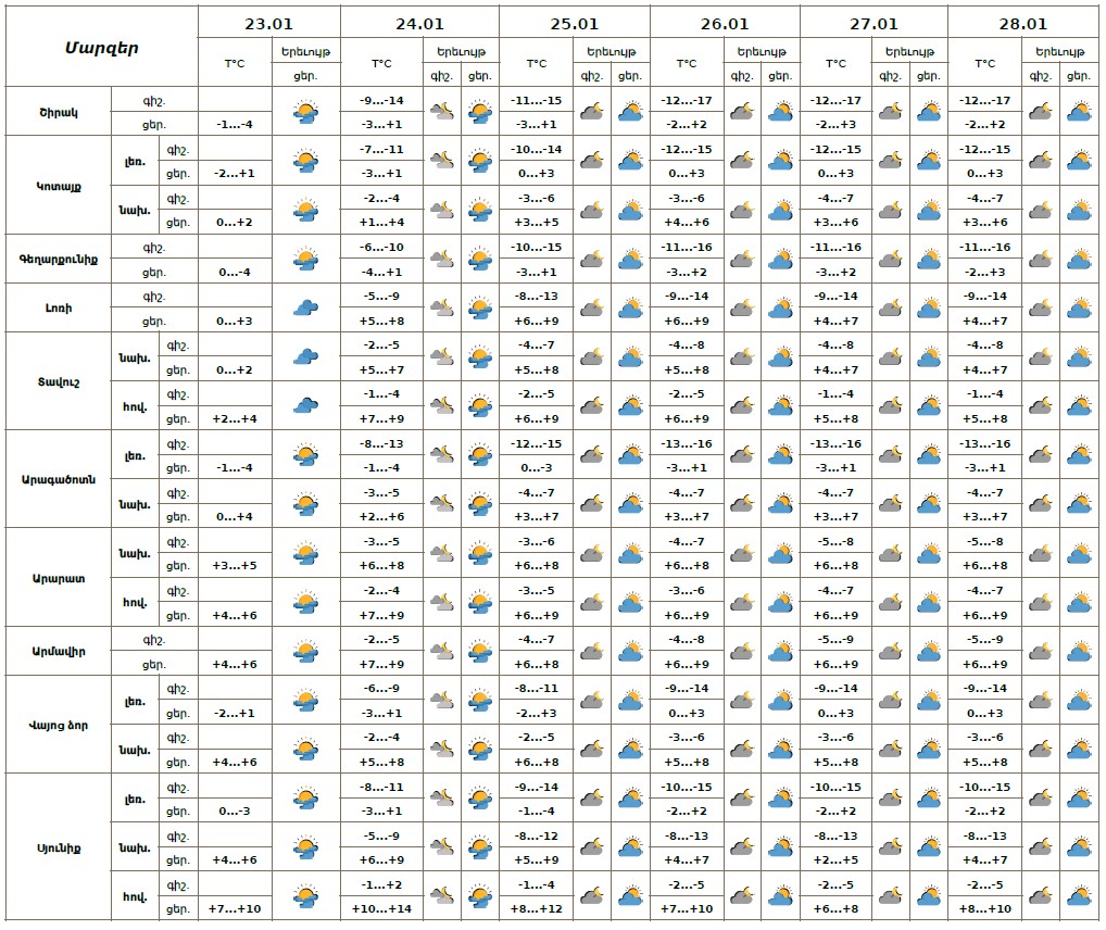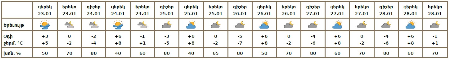 Հունվարի 23-ի ցերեկը, 24-28-ին սպասվում է առանց տեղումների եղանակ:
