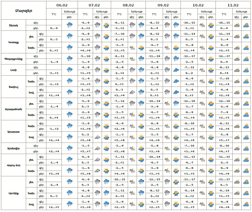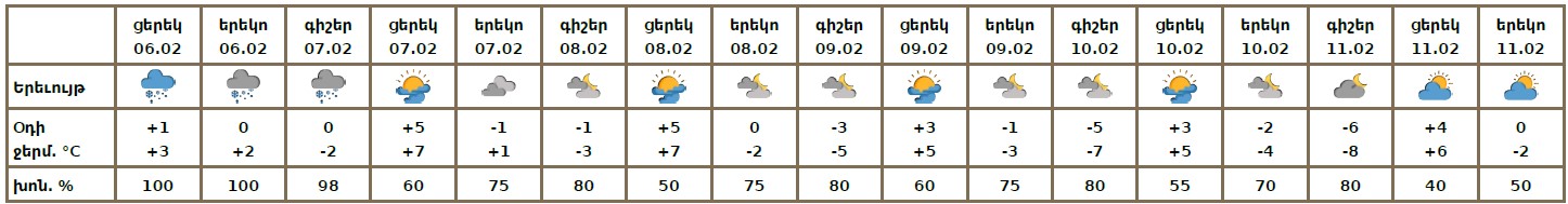 Փետրվարի 6-ի ցերեկը, 7-ի գիշերը սպասվում է ձյուն։ Փետրվարի 7-ի ցերեկը, 8-11-ին սպասվում է առանց տեղումների եղանակ: