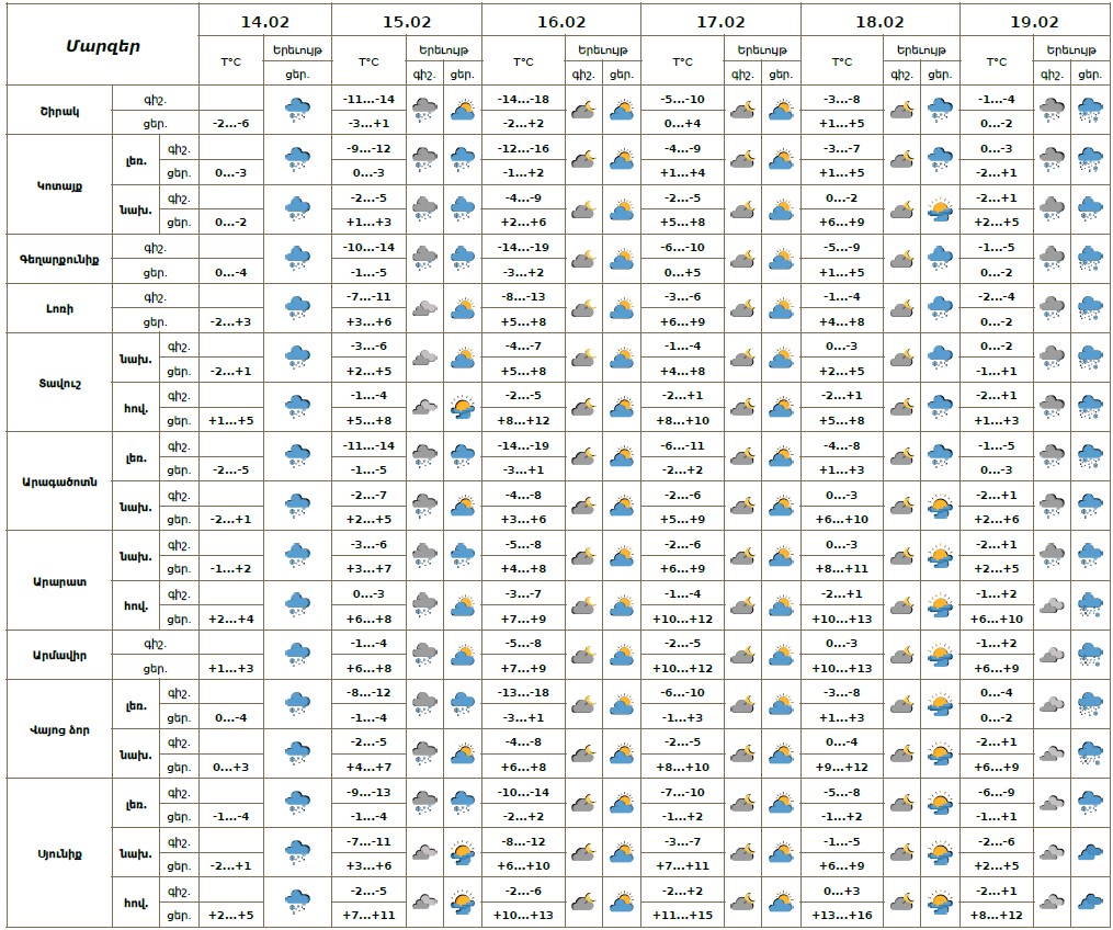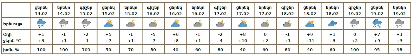 Փետրվարի 14-ի ցերեկը, 15-ի գիշերը և առավոտյան, 19-ին սպասվում է ձյուն։ Փետրվարի 15-ի կեսօրից հետո, 16-18-ին սպասվում է առանց տեղումների եղանակ:
