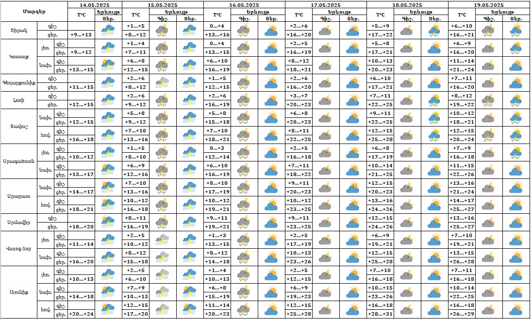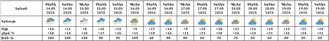 Մայիսի 14-ի ցերեկը, 15-ին, 16-ի գիշերը ժամանակ առ ժամանակ հանրապետության ողջ տարածքում սպասվում է անձրև և ամպրոպ, առանձին հատվածներում՝ հորդառատ, հնարավոր է կարկուտ։ Մայիսի18- 19-ին երեկոյան ժամերին առանձին շրջաններում սպասվում է կարճատև անձրև և ամպրոպ։ Մայիսի 16-ի ցերեկը, 17-ին սպասվում է առանց տեղումների եղանակ։ Քամին՝ հարավարևմտյան՝ 2-5 մ/վ, ամպրոպի ժամանակ՝ քամու ուժգնացում՝ 18-23 մ/վ արագությամբ։ Օդի ջերմաստիճանը մայիսի 14-ի ցերեկը, 15-ին կնվազի ևս 2-4 աստիճանով, 16-18-ին աստիճանաբար կբարձրանա 6-9 աստիճանով։