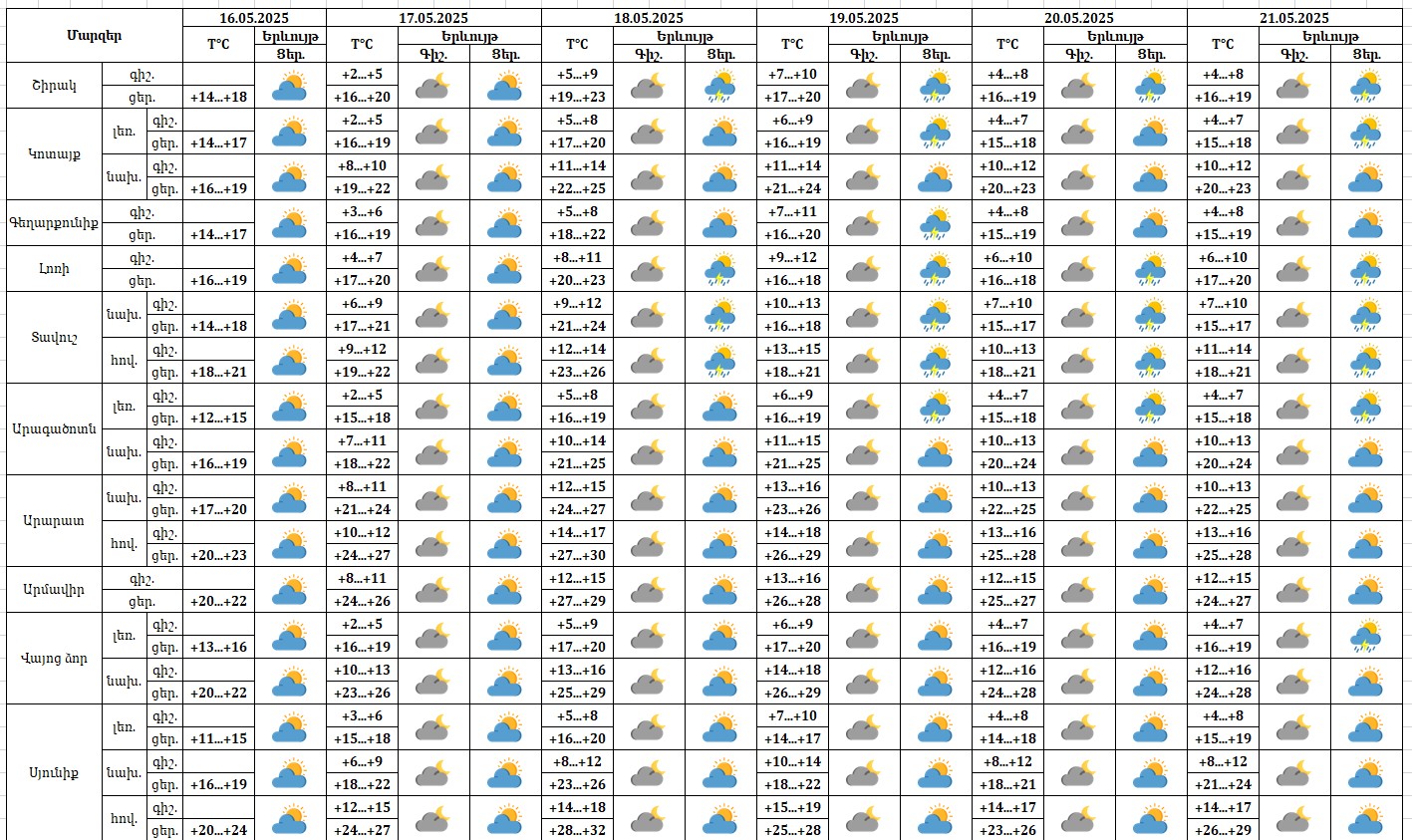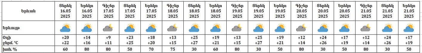 Մայիսի 16-ի ցերեկը, 17-ին սպասվում է առանց տեղումների եղանակ։ Մայիսի 18-21-ին կեսօրից հետո առանձին շրջաններում սպասվում է կարճատև անձրև և ամպրոպ։ Քամին՝ հարավարևմտյան՝ 2-5 մ/վ, ամպրոպի ժամանակ՝ քամու ուժգնացում՝ 17-21 մ/վ արագությամբ։ Օդի ջերմաստիճանը մայիսի 16-ի ցերեկը, 17-18-ին աստիճանաբար կբարձրանա 7-10 աստիճանով։