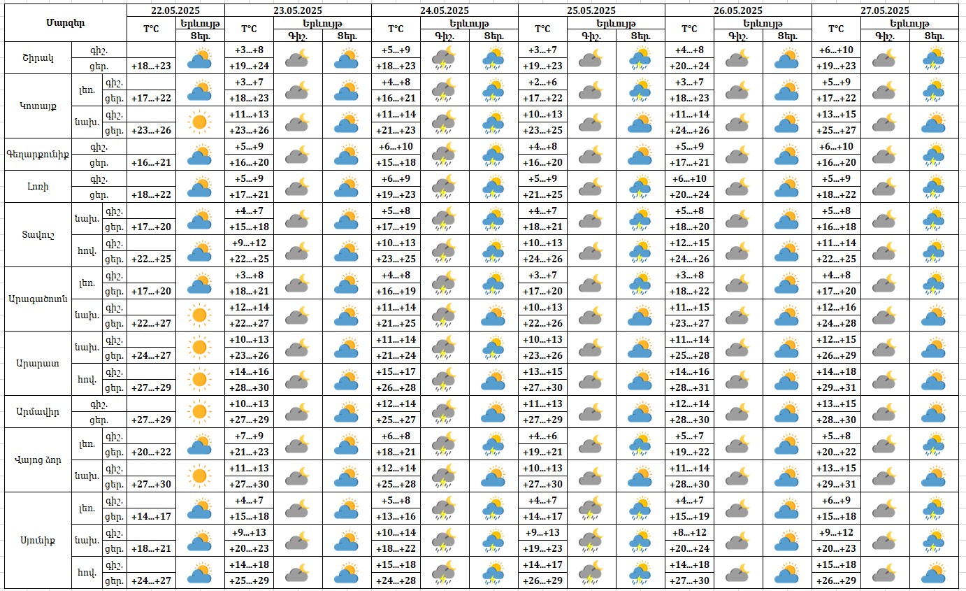Մայիսի 22-ի ցերեկը, 23-ին, 25-26-ին սպասվում է առանց տեղումների եղանակ։ Մայիսի 24-ին ժամանակ առ ժամանակ, 27-ի երեկոյան ժամերին սպասվում է կարճատև անձրև և ամպրոպ, ամպրոպի ժամանակ քամու ուժգնացում՝ 13-15 մ/վ արագությամբ։