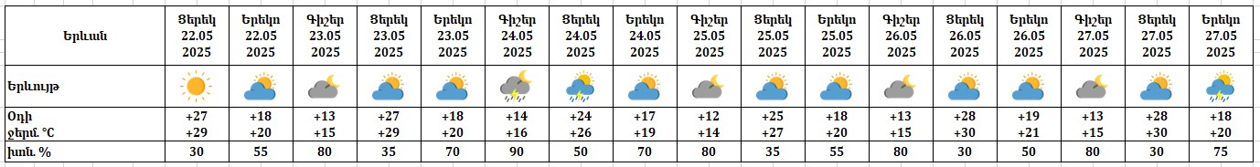 Մայիսի 22-ի ցերեկը, 23-ի գիշերը և 26-ին սպասվում է առանց տեղումների եղանակ։ Մայիսի 23-ին ուշ երեկոյան ժամերին, 24-ին ժամանակ առ ժամանակ, 25-ին և 27-ին կեսօրից հետո առանձին շրջաններում սպասվում է կարճատև անձրև և ամպրոպ։ Քամին՝ արևմտյան՝ 2-5 մ/վ, ամպրոպի ժամանակ սպասվում է քամու ուժգնացում՝ 17-20 մ/վ արագությամբ։ Օդի ջերմաստիճանն էապես չի փոխվի։