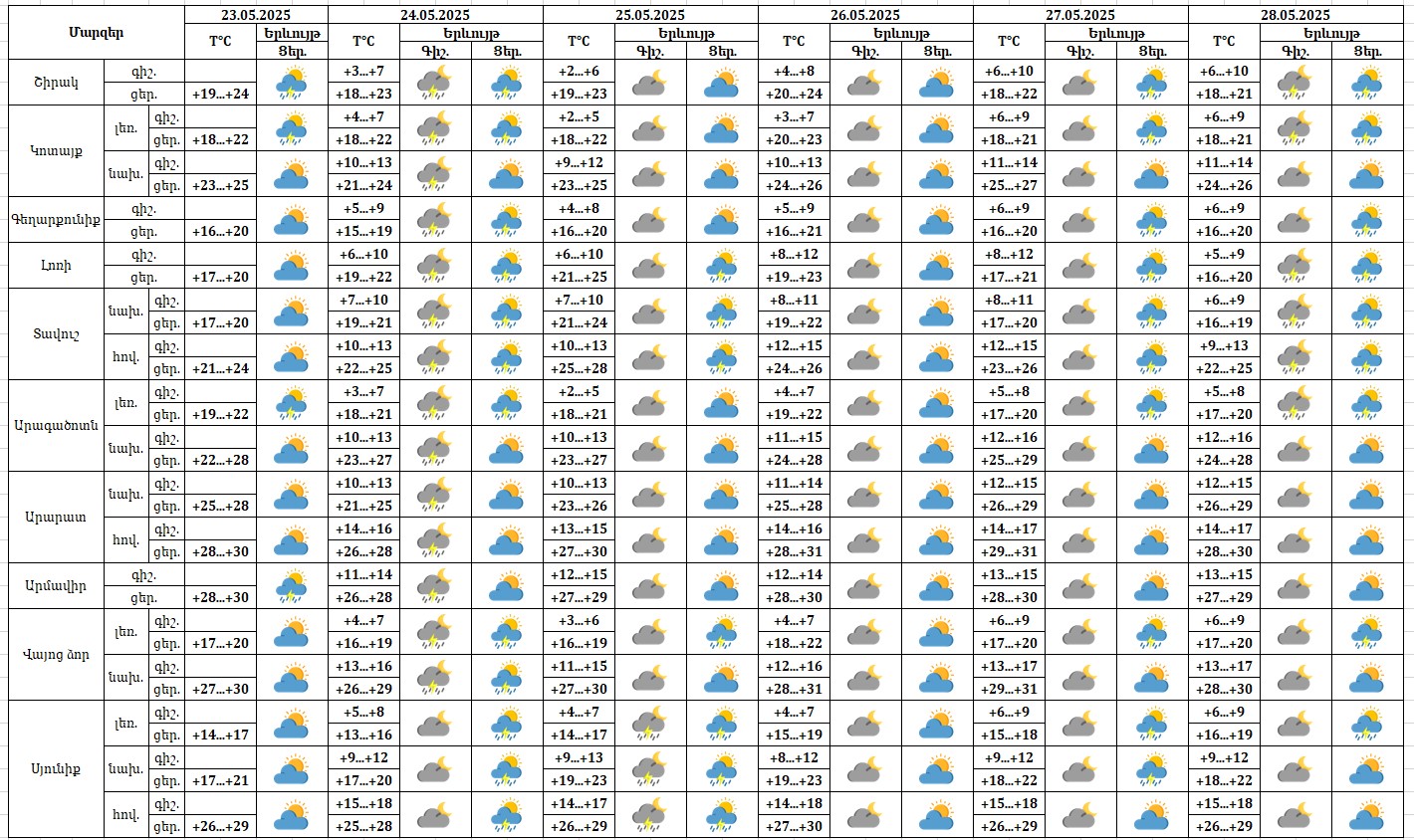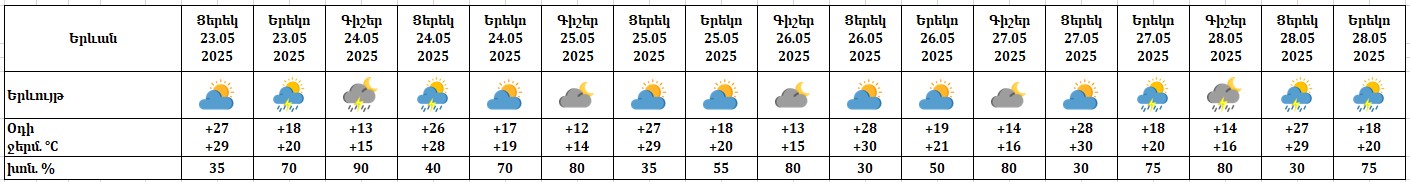 Մայիսի 23-ին ուշ երեկոյան, 24-ին, 25-ին և 27-ին կեսօրից հետո, 28-ին գիշերը և կեսօրից հետո առանձին շրջաններում սպասվում է կարճատև անձրև և ամպրոպ։ Մայիսի 26-ին սպասվում է առանց տեղումների եղանակ։ Քամին՝ արևմտյան՝ 2-5 մ/վ, ամպրոպի ժամանակ սպասվում է քամու ուժգնացում՝ 17-20 մ/վ արագությամբ։ Օդի ջերմաստիճանն էապես չի փոխվի։