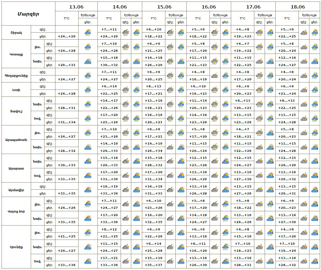Օդի ջերմաստիճանը հունիսի 13-14-ին աստիճանաբար կբարձրանա ևս 2-4 , 16-ին կնվազի 4-6 աստիճանով։