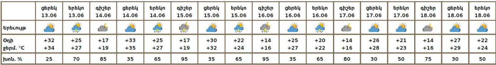 Հունիսի 13-ի ցերեկը, 14-ին երեկոյան ժամերին, 15-16-ին գիշերը և երեկոյան ժամերին քաղաքի առանձին հատվածներում հնարավոր է կարճատև անձրև և ամպրոպ, ամպրոպի ժամանակ քամու ուժգնացում՝ 15-18 մ/վ արագությամբ։ Հունիսի 17-18-ին սպասվում է առանց տեղումների եղանակ։