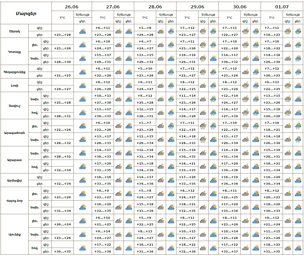 Օդի ջերմաստիճանը հունիսի 26ի ցերեկը, 27-28-ին աստիճանաբար կբարձրանա 2-4 աստիճանով։