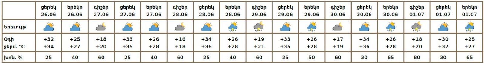 Հունիսի 26-ի ցերեկը, 27-ին սպասվում է առանց տեղումների եղանակ։ Հունիսի 28-ին ուշ երեկոյան, 29-30-ին, հուլիսի 1-ին գիշերը և երեկոյան ժամերին քաղաքի առանձին հատվածներում հնարավոր է կարճատև անձրև և ամպրոպ, ամպրոպի ժամանակ քամու ուժգնացում 17-20մ/վրկ։