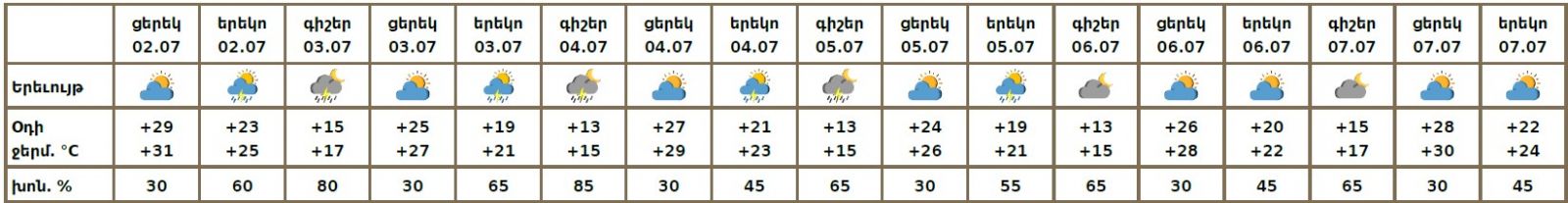 Հուլիսի 2-ի երեկոյան ժամերին, հուլիսի 3-5-ին գիշերը և երեկոյան հնարավոր է կարճատև անձրև և ամպրոպ։ Հուլիսի 6-7-ին սպասվում է առանց տեղումների եղանակ։Սպասվում է քամու ուժգնացում ամպրոպի ժամանակ՝ 17-21մ/վրկ, երեկոյան ժամերին՝ 15- 18մ/վ։