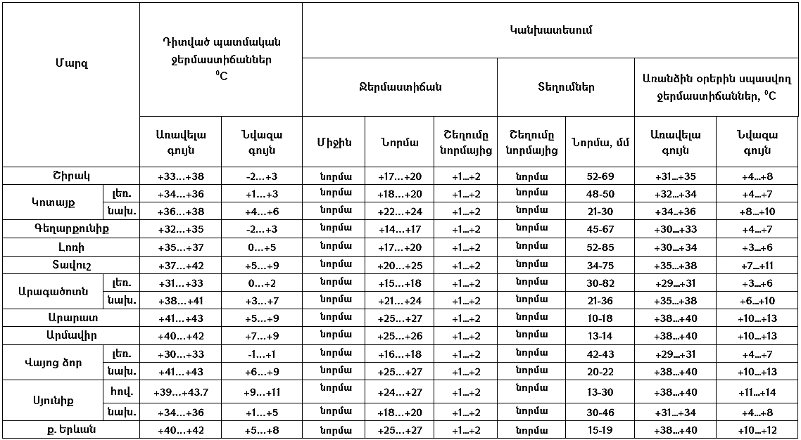 Օդի ամսական միջին ջերմաստիճանը և տեղումների քանակը հանրապետության ողջ տարածքում կանխատեսվում է նորմայի սահմաններում։