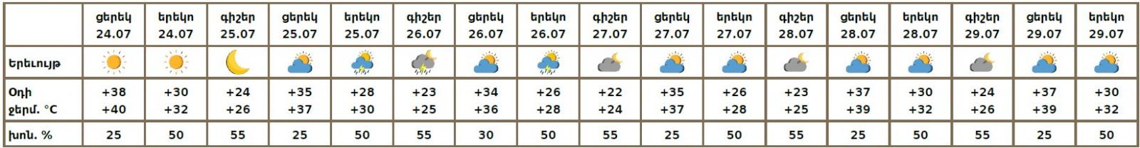 Հարավից արևադարձային տաք օդի ալիքի ներթափանցմամբ պայմանավորված՝ հուլիսի 24-ին Արարատյան դաշտում, Սյունիքի հովիտային գոտում և Երևանում սպասվում է բարձր ջերմային ֆոն․ ցերեկը ժամը 16։00-17-00- ն ընկած ժամանակահատվածում՝ +38․․․+40 աստիճան տաքություն։ Նշված հատվածներում ինչպես նաև Արագածոտնի, Կոտայքի և Վայոց ձորի նախալեռներում առաջիկա 5 օրերին սպասվում է նաև բարձր կարգի հրդեհավտանգ իրավիճակ։