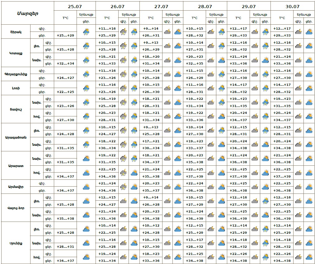 Օդի ջերմաստիճան 25-26-ի ցերեկն աստիճանաբար կնվազի 2-4 աստիճանով, հուլիսի 27-29-ին աստիճանաբար նույնքան կբարձրանա։