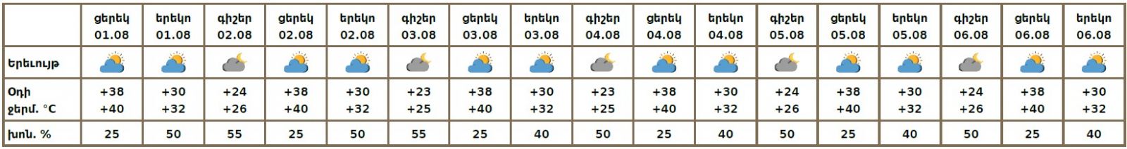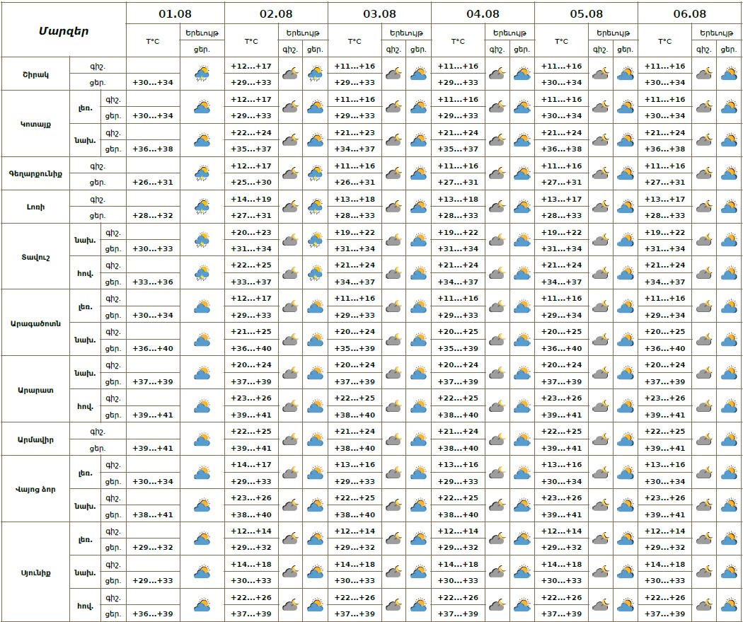 Oգոստոսի 1-ի ցերեկը, 2-6-ին սպասվում է առանց տեղումների եղանակ։ Երեկոյան ժամերին սպավում է քամու ուժգնացում՝ 12- 15 մ/վ արագությամբ։