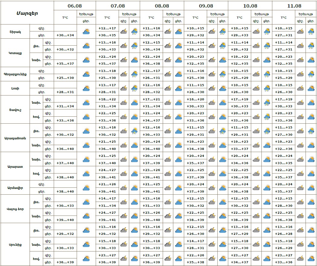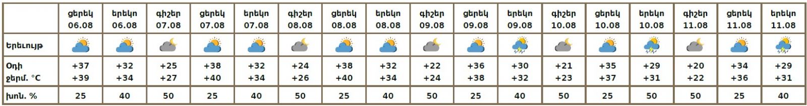 Օգոստոսի 6-ի ցերեկը, 8-ին սպասվում է առանց տեղումների եղանակ։ Օգոստոսի 7-ի ցերեկը, 9-11-ին առանձին շրջաններում սպասվում է կարճատև անձրև և ամպրոպ: