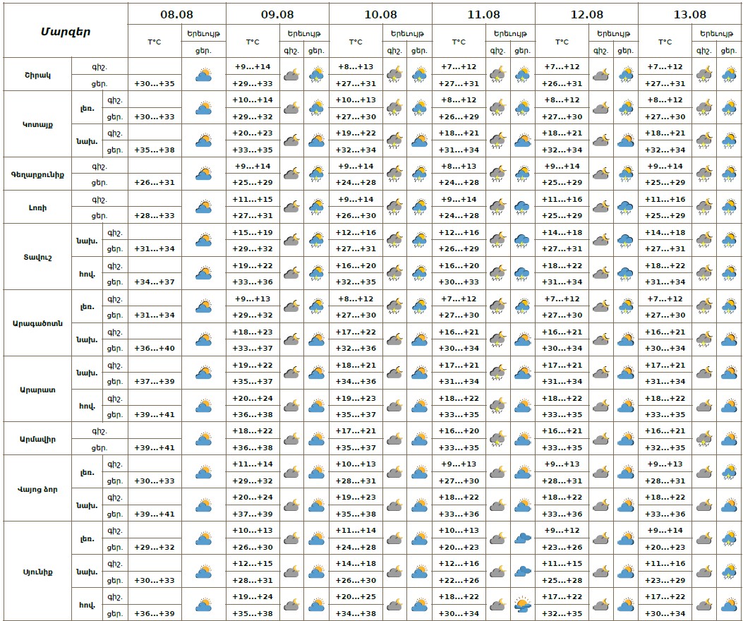 Օգոստոսի 8-ի ցերեկը սպասվում է առանց տեղումների եղանակ։ Օգոստոսի 9-ին երեկոյան ժամերին, 10-13-ին գիշերը և երեկոյան առանձին շրջաններում սպասվում է կարճատև անձրև և ամպրոպ, հնարավոր է կարկուտ: