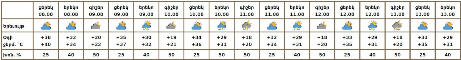 Օգոստոսի 8-ի ցերեկը սպասվում է առանց տեղումների եղանակ։ Օգոստոսի 9-ի երեկոյան, 10-12-ին գիշերը և երեկոյան, 13-ին գիշերը քաղաքի առանձին հատվածներում հնարավոր է կարճատև անձրև և ամպրոպ, ամպրոպի ժամանակ և երեկոյան ժամերին սպասվում է քամու ուժգնացում՝ 14-18 մ/վ արագությամբ։