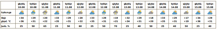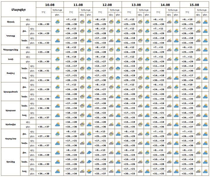 Օգոստոսի 10-ի երեկոյան, 11-13-ին գիշերը և երեկոյան, 14-ի երեկոյան առանձին շրջաններում սպասվում է կարճատև անձրև և ամպրոպ, հնարավոր է կարկուտ: Քամին՝ հարավարևմտյան 2-5մ/վ, ամպրոպի ժամանակ սպասվում է քամու ուժգնացում 17-20մ/վ արագությամբ։ Օգոստոսի 10-15-ին երեկոյան ժամերին Արմավիրում, Կոտայքի և Արագածոտնի նախալեռներում սպասվում է քամու ուժգնացում՝ 15-18 մ/վ արագությամբ։ Օգոստոսի 15-ին սպասվում է առանց տեղումների եղանակ։ Օդի ջերմաստիճանն օգոստոսի 10-ի ցերեկը, 11-13-ին աստիճանաբար կնվազի ևս 2-4 աստիճանով: