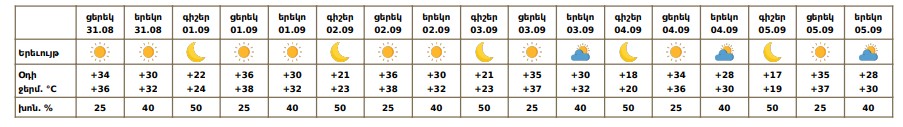 Օգոստոսի 31-ի ցերեկը, սեպտեմբերի 1-5-ին սպասվում է առանց տեղումների եղանակ: Քամին՝ հարավային 2-5մ/վ։ Օդի ջերմաստիճանն օգոստոսի 31-ից սեպտեմբերի 2-ին աստիճանաբար կբարձրանա 2-5 աստիճանով։